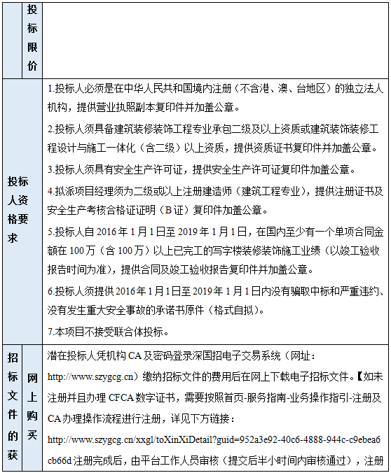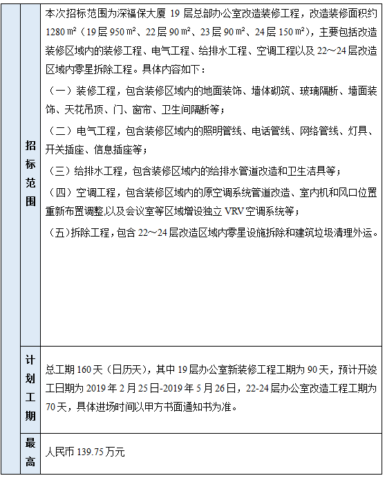 乐鱼leyu大厦19层总部办公室区域改造装修工程(项目名称)招标方(招标人)为深圳市乐鱼leyu(集团)有限公司(招标人单位名称),采购资金来自企业自筹(资金来源),项目出资比例为100%。项目已具备招标条件,现进行国内公开招标。