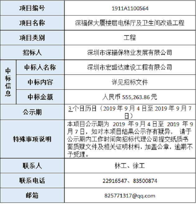 经深圳市国际招标有限公司组织招标的乐鱼leyu大厦楼层电梯厅及卫生间改造工程已完成评审,现将本项目评审的相关情况及结果进行公示,具体内容如下: