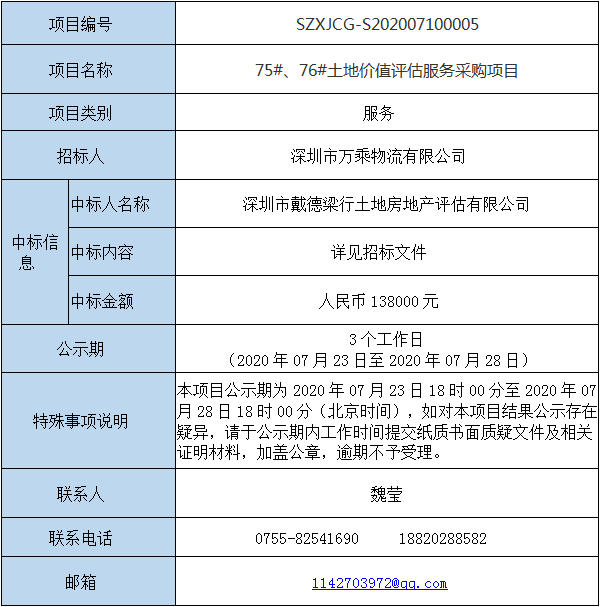 深圳市万乘物流有限公司75#、76#土地价值评估服务采购项目(项目编号:SZXJCG-S202007100005)已完成评审,具体内容如下: