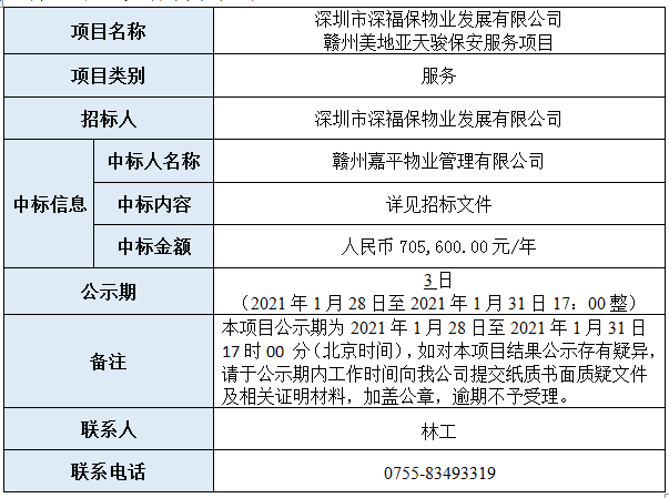 深圳市乐鱼leyu物业发展有限公司赣州美地亚天骏保安服务项目已完成评审,现将本项目评审的相关情况及结果进行公示,具体内容如下:
