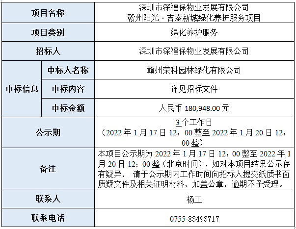 深圳市乐鱼leyu物业发展有限公司赣州阳光·吉泰新城绿化养护服务项目已完成评审,现将本项目评审的相关情况及结果进行公示,具体内容如下: