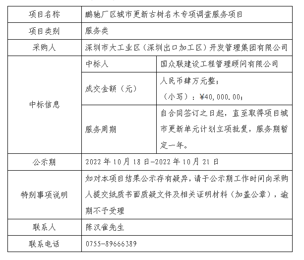 鹏驰厂区城市更新古树名木专项调查服务中标结果公示