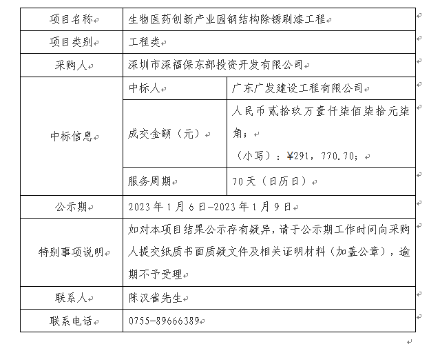 在深圳市建设工程材料设备询价采购平台进行公开招标的生物医药创新产业园钢结构除锈刷漆工程(项目编号:SZXJCG-S202212160005)已完成评审及定标,现将本项目评审的相关情况及中标结果进行公示,具体内容如下: