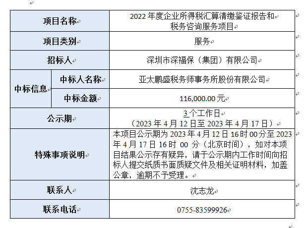 2022年度企业所得税汇算清缴鉴证报告和税务咨询服务项目中标结果公示