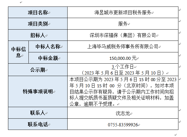 海昱城市更新项目税务服务已完成评审,现将本项目评审的相关情况及结果进行公示,具体内容如下: