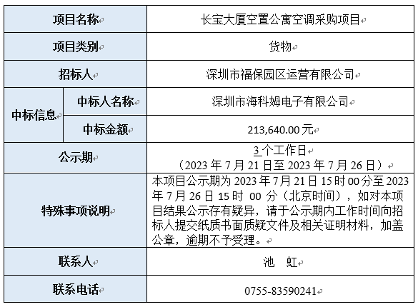 长宝大厦空置公寓空调采购项目已完成评审,现将本项目评审的相关情况及结果进行公示,具体内容如下: