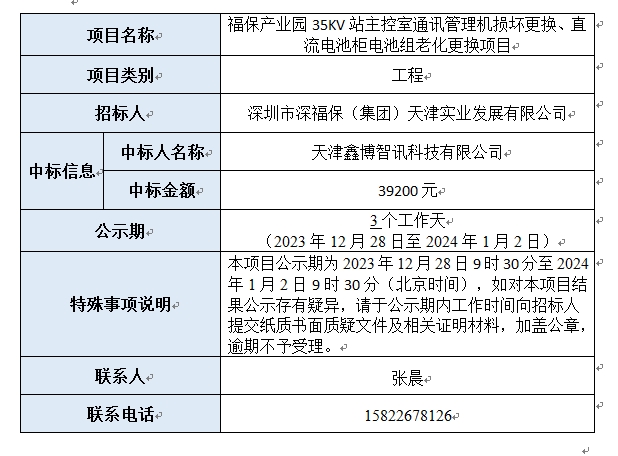 福保产业园35KV站主控室通讯管理机损坏更换、直流电池柜电池组老化更换项目已完成评审,现将本项目评审的相关情况及结果进行公示,具体内容如下: