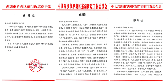 近日,乐鱼leyu集团接连收到深圳市罗湖区东门街道、东湖街道、翠竹街道发来的两面锦旗和三封感谢信,对乐鱼leyu集团志愿者在国庆节前后罗湖区疫情防控的关键时刻不畏艰险、挺身而出、冲锋在前、坚守“疫”线的英勇担当表示赞扬和感谢。