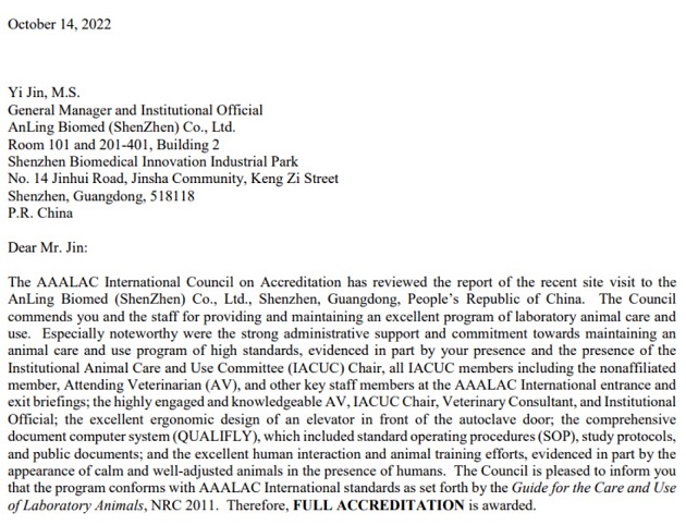 近日,深圳市生物医药创新产业园入驻企业安领生物医药(深圳)有限公司(以下简称“安领(深圳)”)成功获得了国际实验动物评估和认可委员会(AAALAC国际)的“完全认可”(Full Accreditation)。