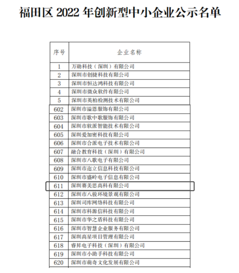 为进一步提升深圳中小企业创新能力和专业化水平,促进中小企业高质量发展,引导中小企业走专精特新发展道路,提升中小企业创新能力和专业化水平,深圳市对优质中小企业进行大力培育。优质中小企业是指在产品、技术、管理、模式等方面创新能力强、专注细分市场、成长性好的中小企业,“创新型中小企业(原深圳市专精特新企业)”具有较高专业化水平、较强创新能力和发展潜力,是优质中小企业的基础力量。此次通过“福田区2022创新型中小企业(原深圳市专精特新企业)”认定,不仅是赛美思始终紧跟国家创新驱动发展战略,高度重视自主创新的体现,也是国家对赛美思科研创新实力和企业发展潜力的认可。